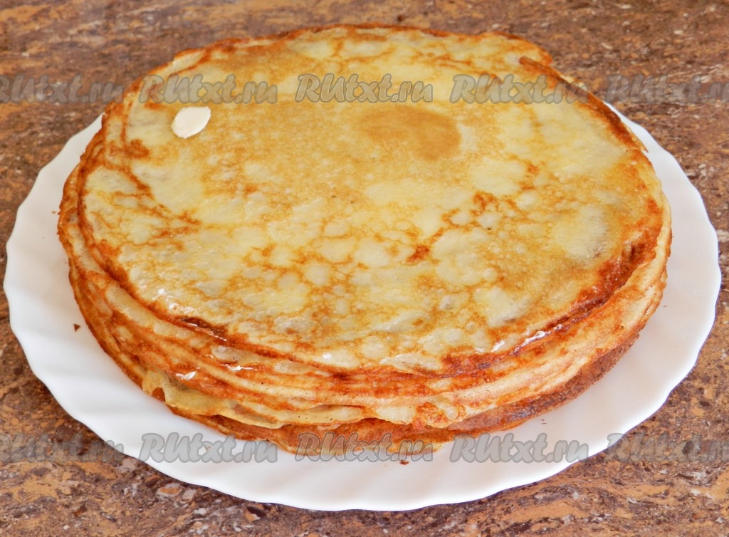 Готовые блины складывать стопкой и смазывать сливочным маслом (по желанию).