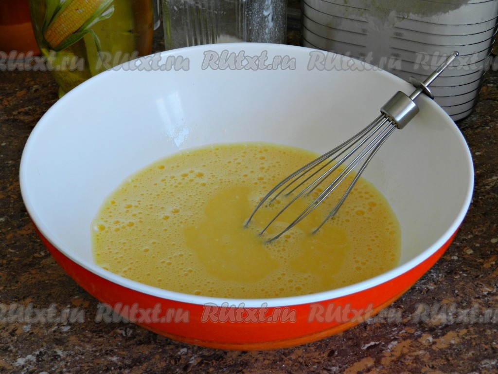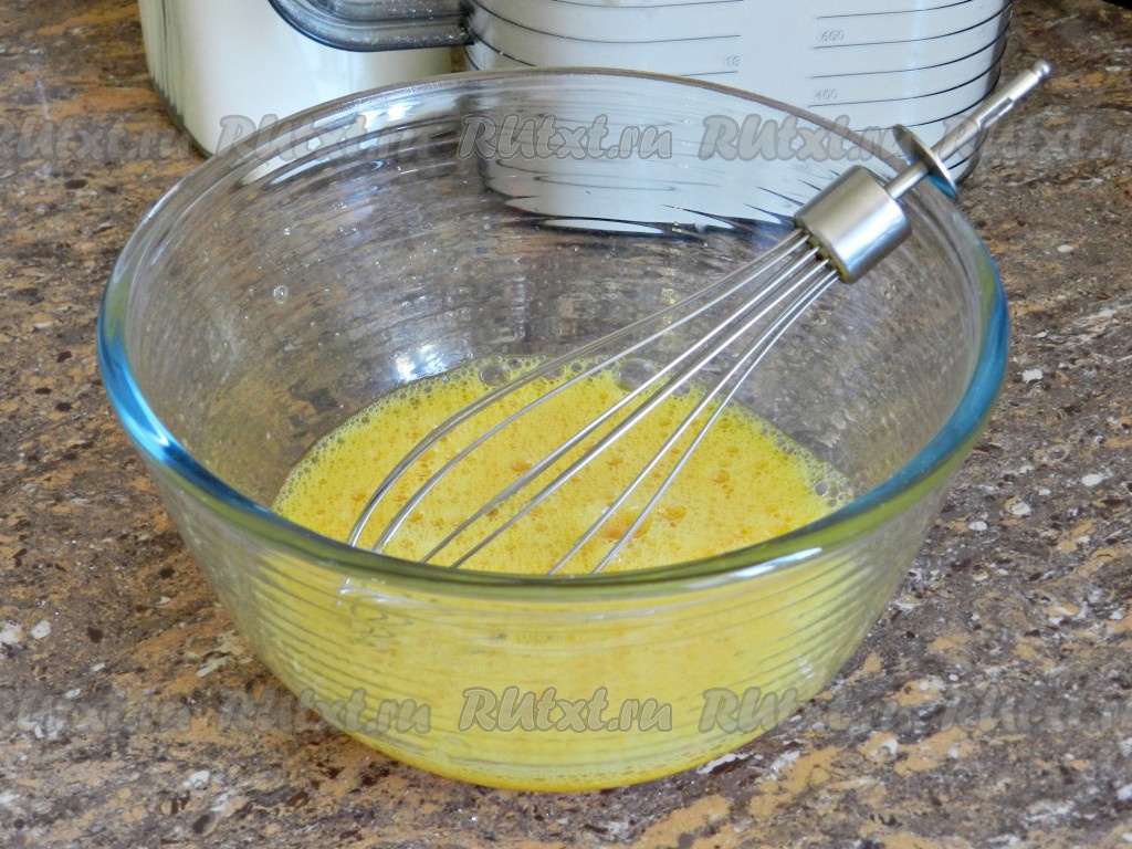 В отдельной миске взбить яйца с солью и оставшимся сахаром.