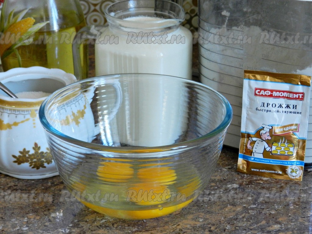 Кислое молоко подогреть. Примерно 150 мл вылить в миску, добавить дрожжи и 0,5 чайной ложки сахара.