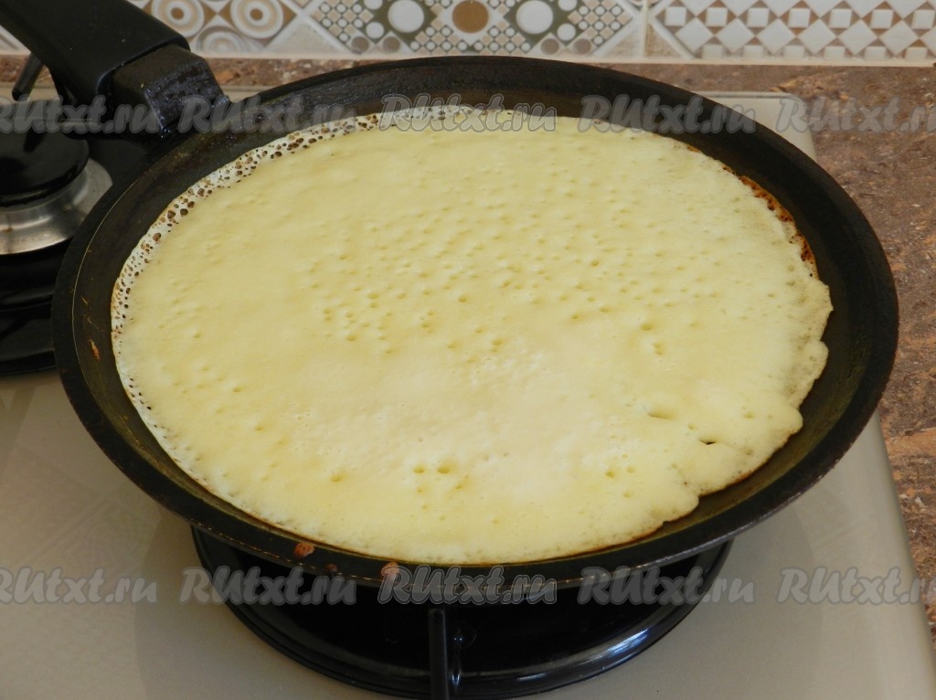Жарить блины на сковороде, смазанной маслом, на среднем огне. Сначала с одной стороны до золотистого цвета, затем - с другой.