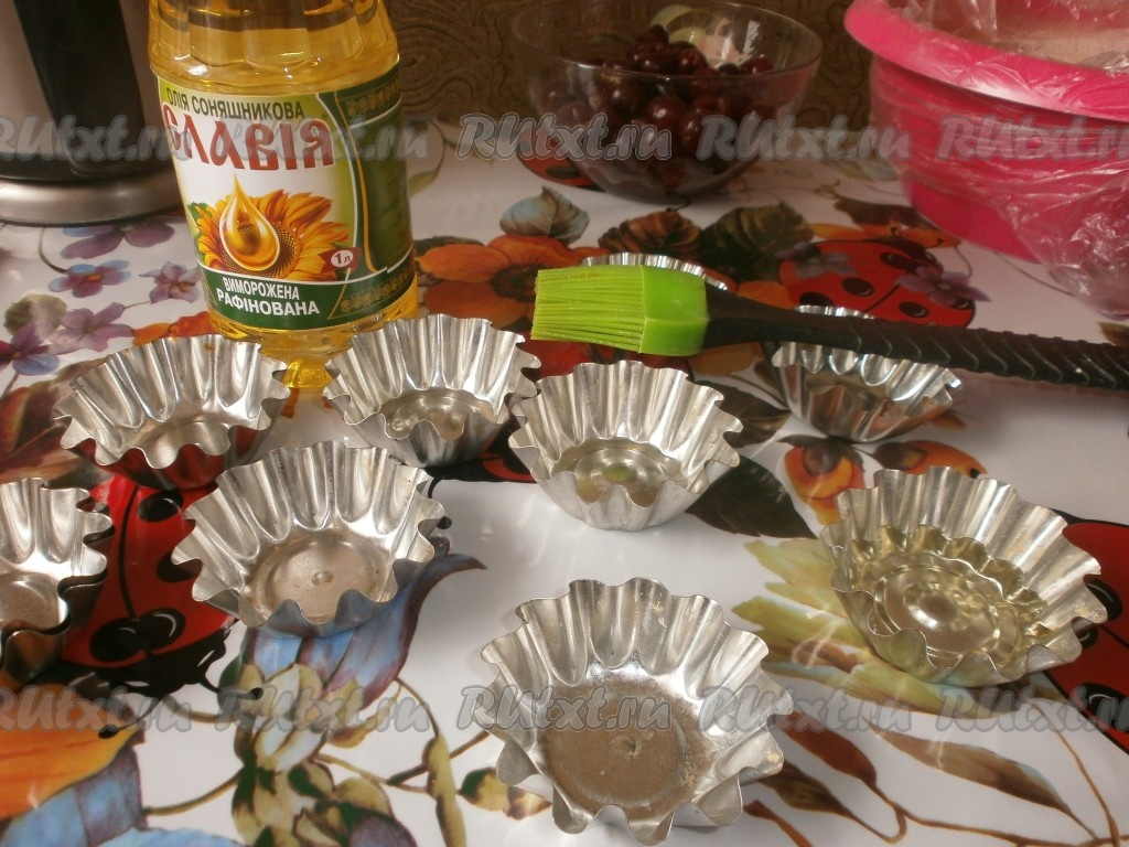 Берём формочки, каждую смазываем подсолнечным маслом (силиконовые можно не смазывать). Ложкой выкладываем немного теста, затем - вишенки и сверху кладем ещё немного теста, заполняя формочки на 2/3 объёма. Духовку разогреваем до 160 градусов и выпекаем наши кексы с вишней до готовности (продолжительность выпечки зависит от размера формочек).
