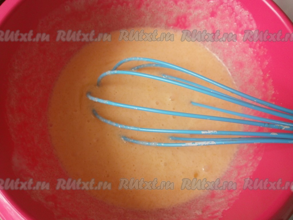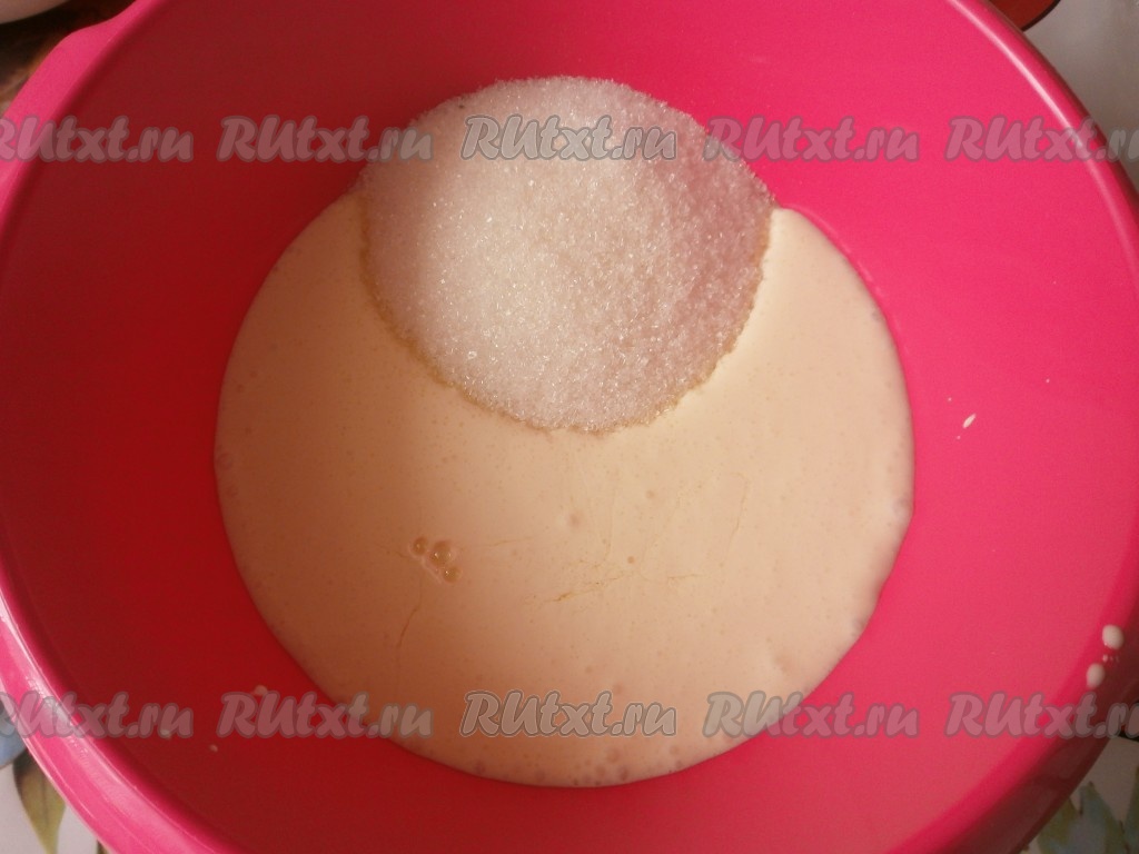 Далее добавляем сахар и яйца, перемешиваем тесто венчиком.