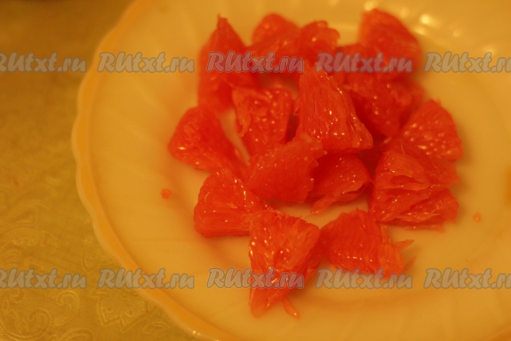 Грейпфрут освободить от кожицы и разделить на небольшие кусочки.