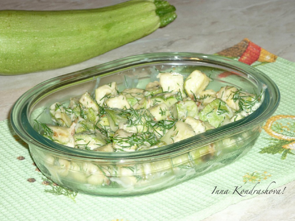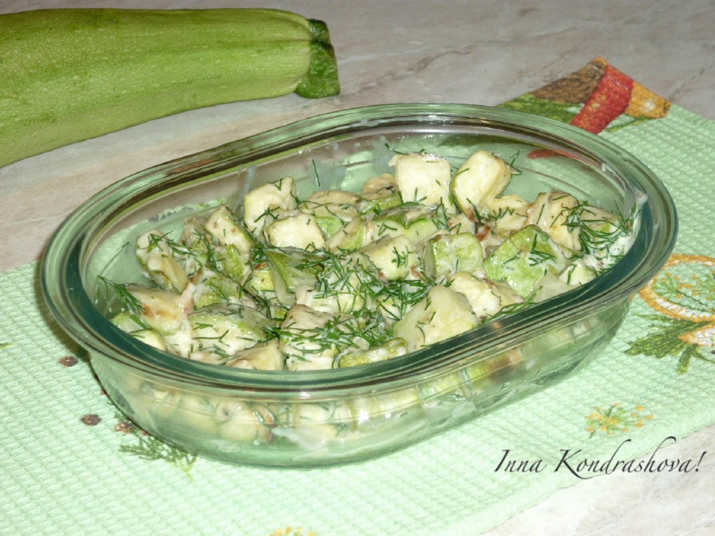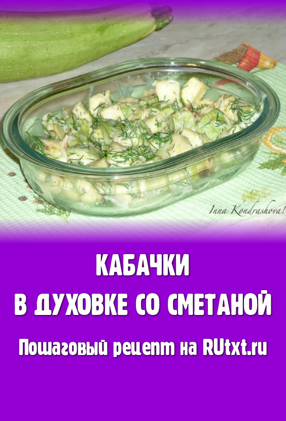 В сметану добавить мелко нарезанный укроп, пропущенный через пресс чеснок, хорошо перемешать. Дать кабачкам, приготовленным в духовке, немного остыть и тёплыми смешать со сметанной массой.