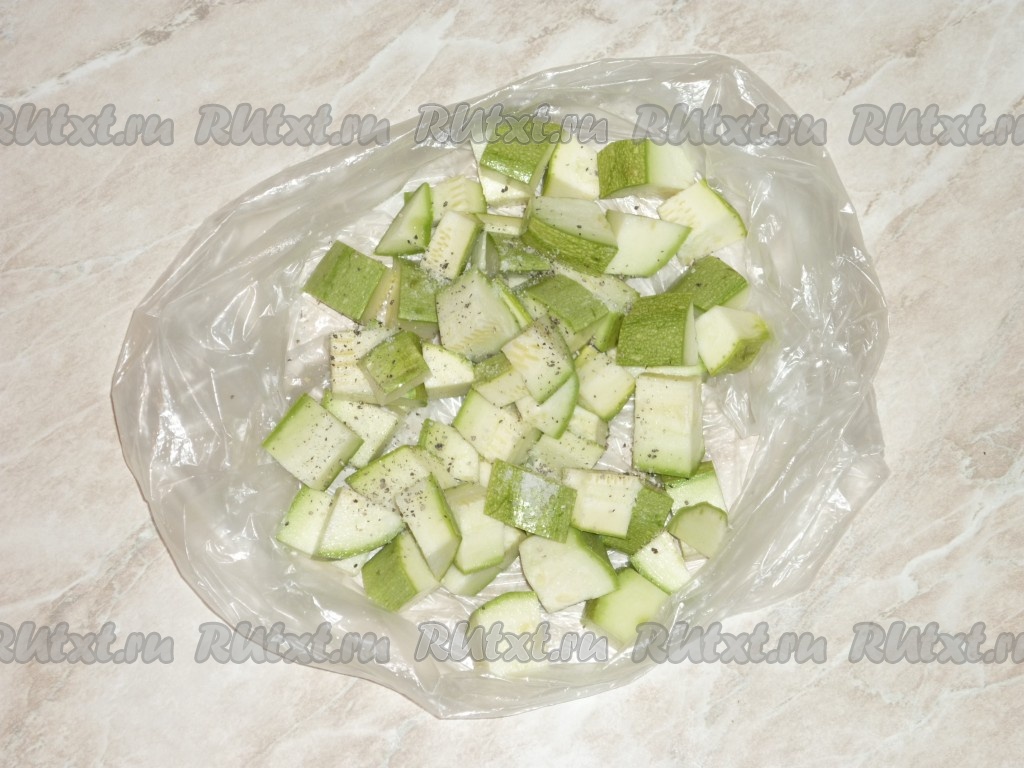 Для удобства поместить нарезанный овощ в полиэтиленовый пакет, всыпать соль и чёрный молотый перец по вкусу.