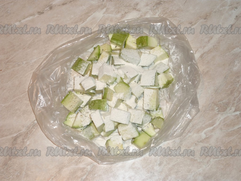 Добавить муку. Пакет закрыть и несколько раз хорошо встряхнуть, чтобы содержимое хорошо перемешалось и все кубики кабачка равномерно покрылись мукой и специями.