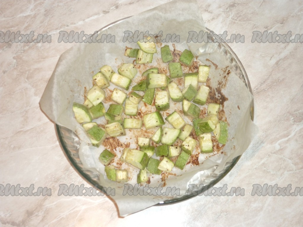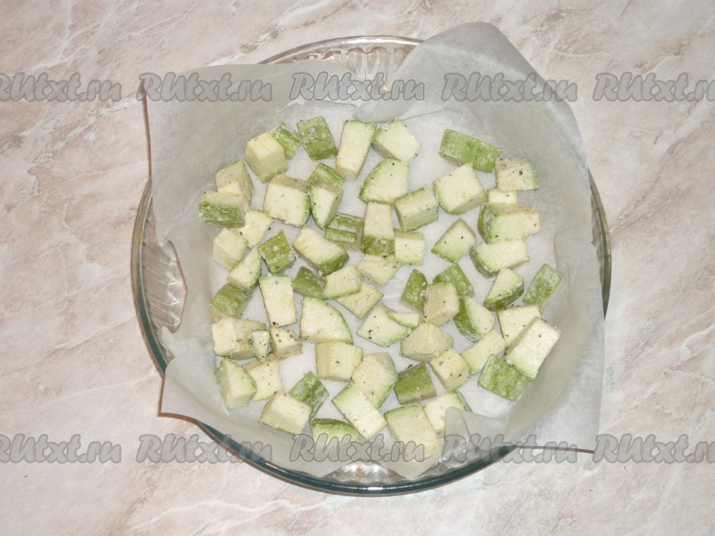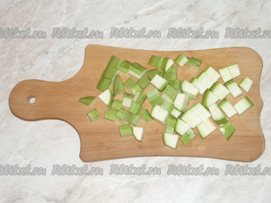 Нарезать кабачок крупными кубиками. Можно нарезать и полукольцами, но тогда запекаться будет немного дольше.