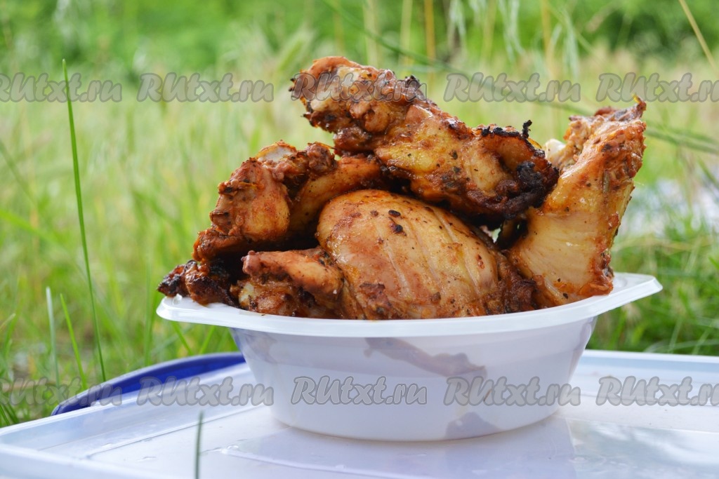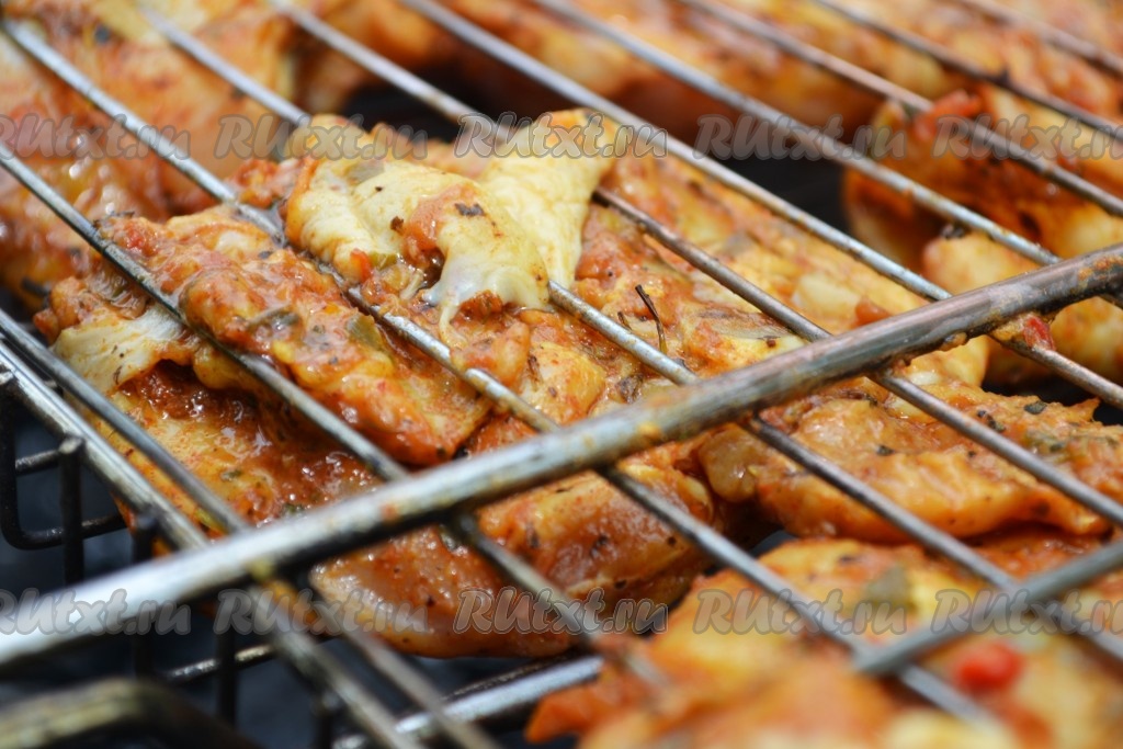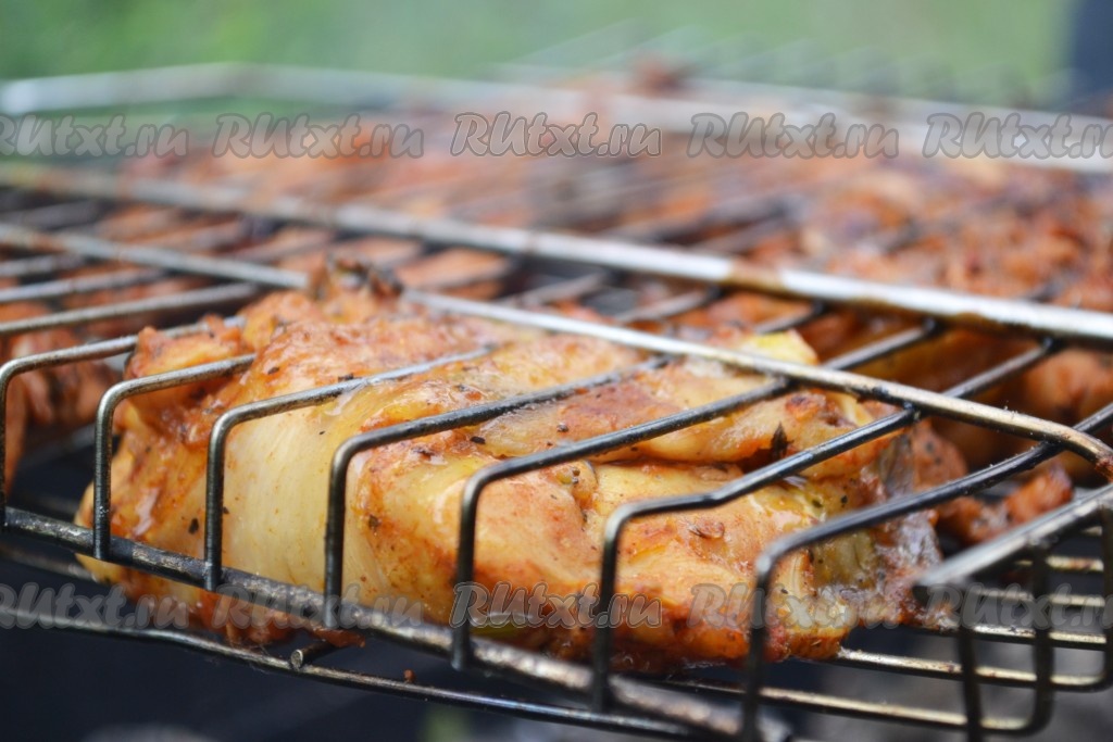 Чтобы мясо не пересохло и полностью прожарилось, нужно постоянно переворачивать решетку и жарить курицу то с одной, то с другой стороны. Время приготовления шашлыка на углях займет 20-25 минут.