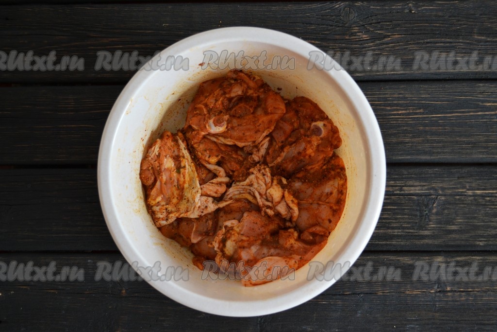 Всыпаем к мясу приправы и соль, хорошенько перемешиваем, как бы втирая специи.