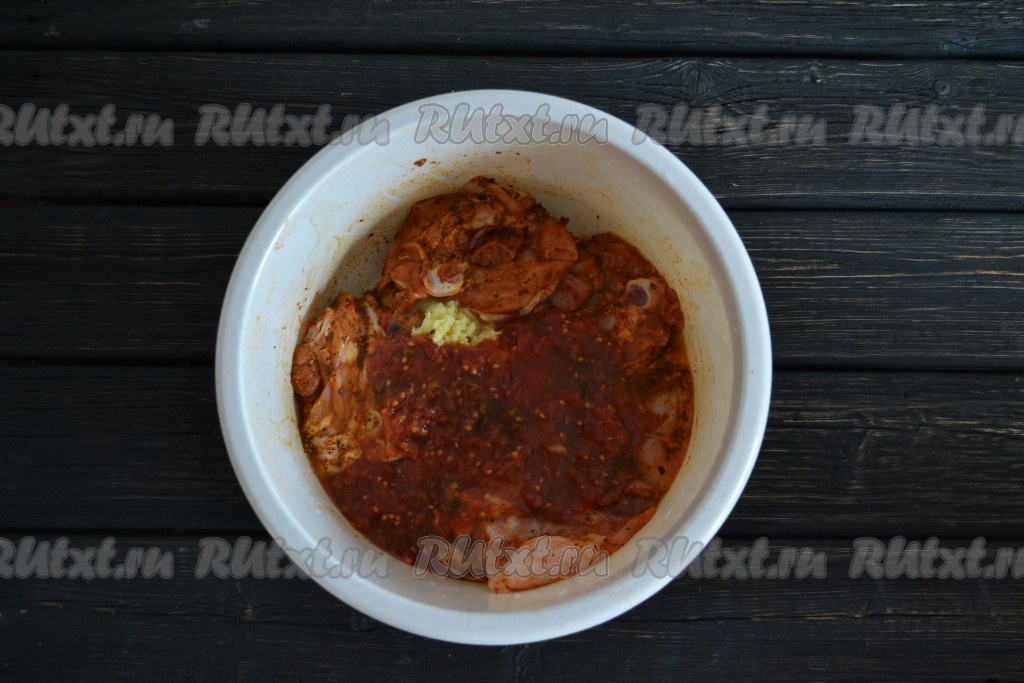 Шашлык из куриных бёдер по этому рецепту получается нежным, сочным и ароматным, а благодаря тому, что он приготовлен на углях, еще и необыкновенно вкусным. Особое очарование, пикантность, кислинку и красивый цвет курице придаёт маринад из имбиря и помидоров. Сухие приправы, использованные в рецепте, можно изменять, исходя из желаний. Приготовьте и убедитесь сами, что шашлык из куриных бедер получается очень вкусным.