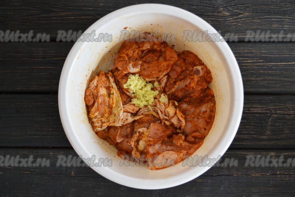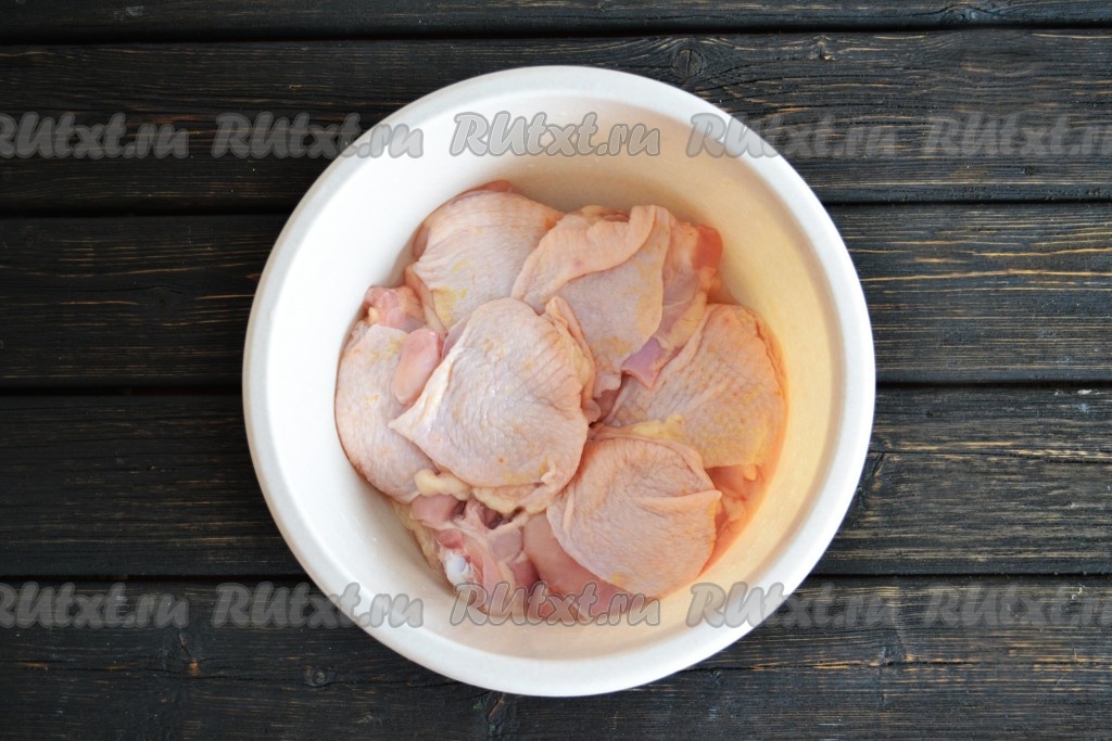 Моем куриные бедра, обтираем салфетками, удаляя лишнюю влагу. Складываем в миску, в которой будет мариноваться курочка.
