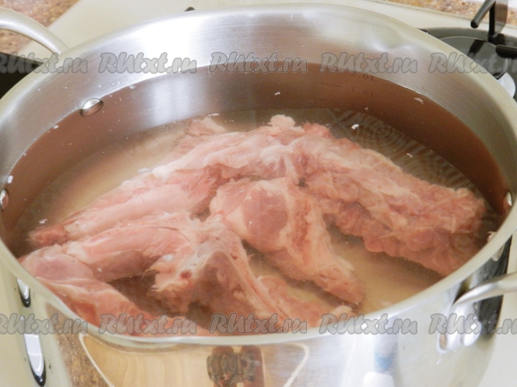 Основа любого борща - вкусный, насыщенный бульон. Свиные ребра залить двумя литрами холодной воды и поставить на огонь. Когда вода закипит, тщательно снять всю пену, уменьшить огонь до минимального и варить в течение 1 часа.