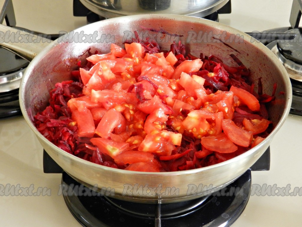 Добавить помидоры на сковороду в овощную заправку.