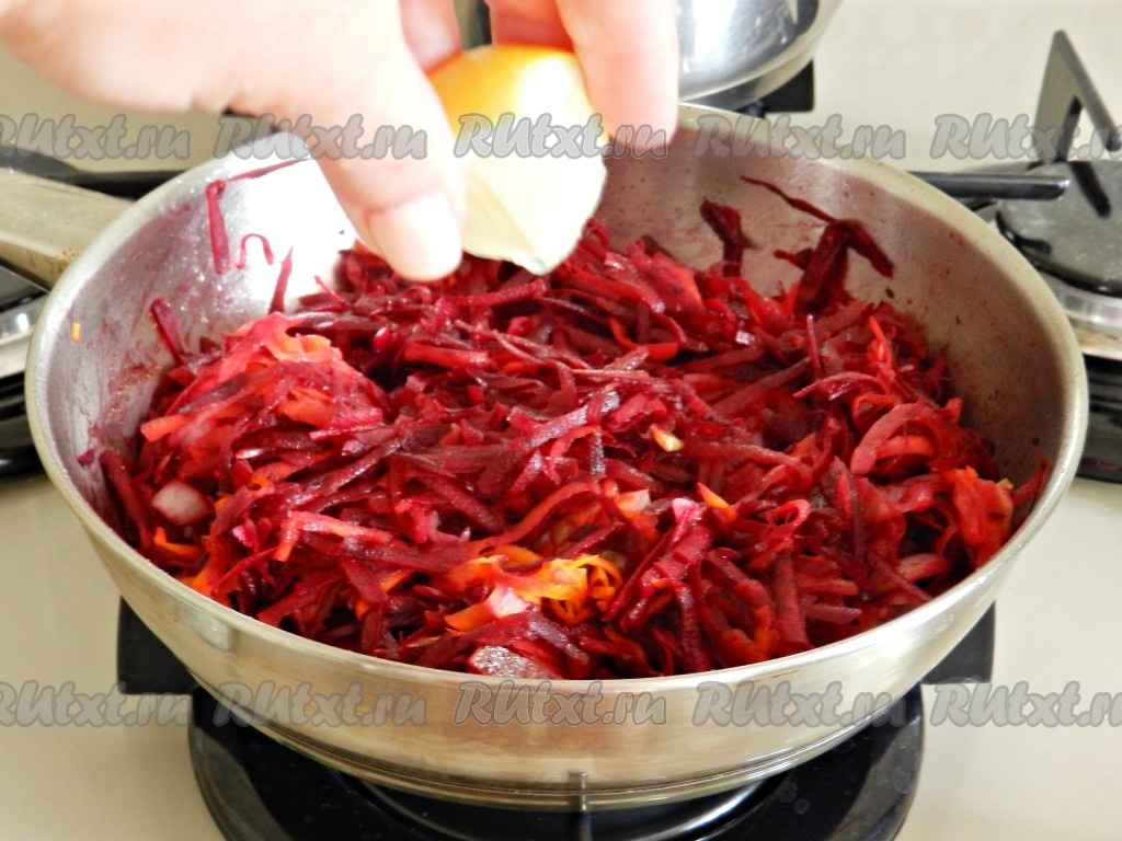 Сбрызнуть лимонным соком, перемешать и обжарить вместе в течение 5 минут, иногда помешивая.