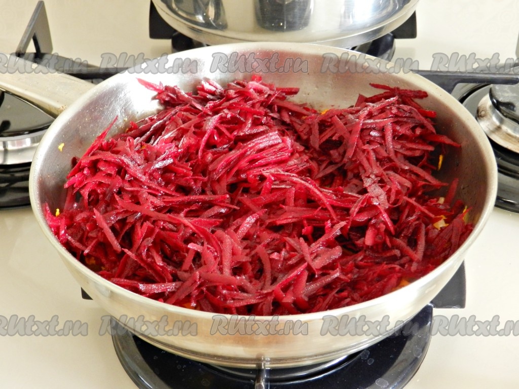 Добавить свеклу в сковороду к моркови и луку.