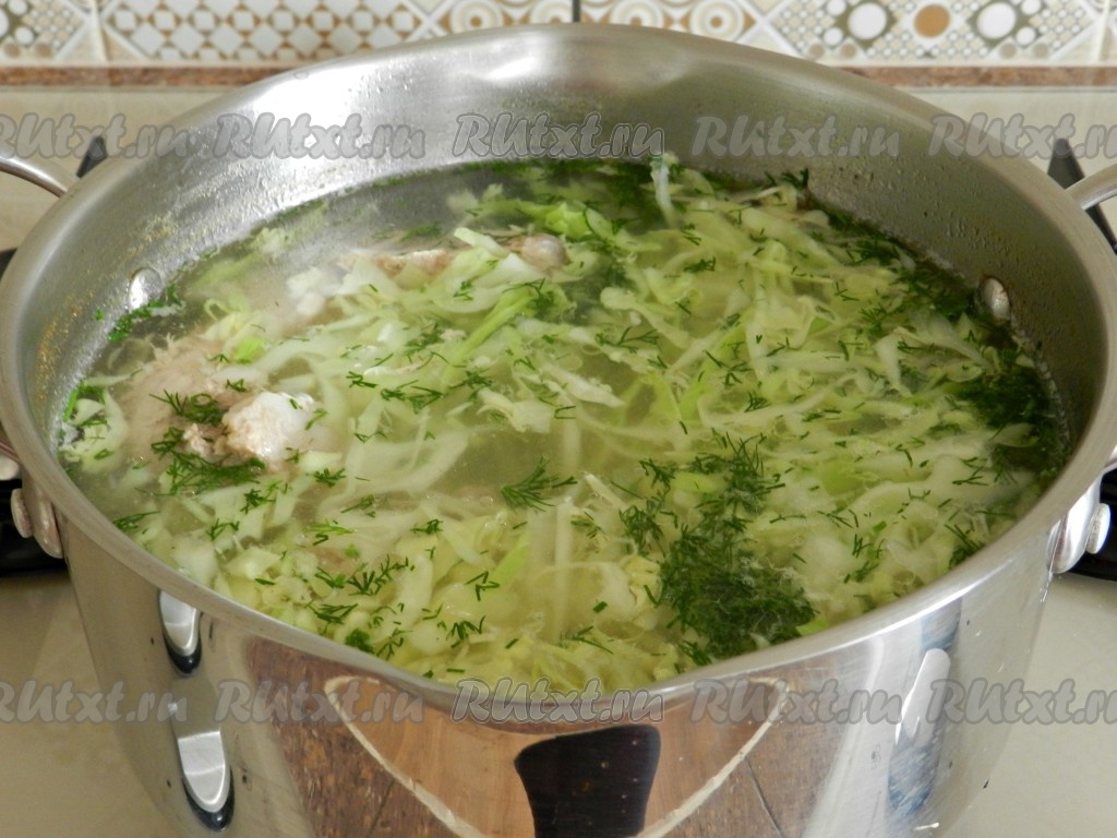 Когда бульон сварится, посолить его, добавить картофель и сварить до готовности. Затем добавить капусту и мелко нарезанную зелень. Капусту варить не долго, не более 5 минут. Капуста в борще не должна быть разваренной.