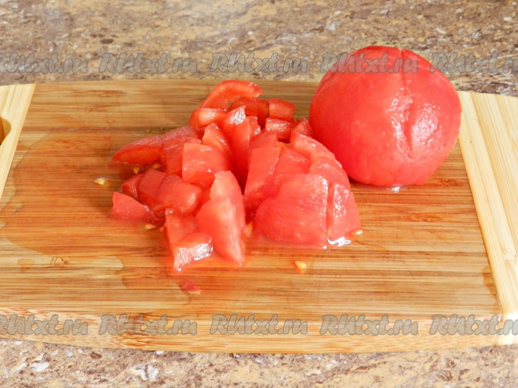 С помидоров снять кожицу и нарезать их кубиками.