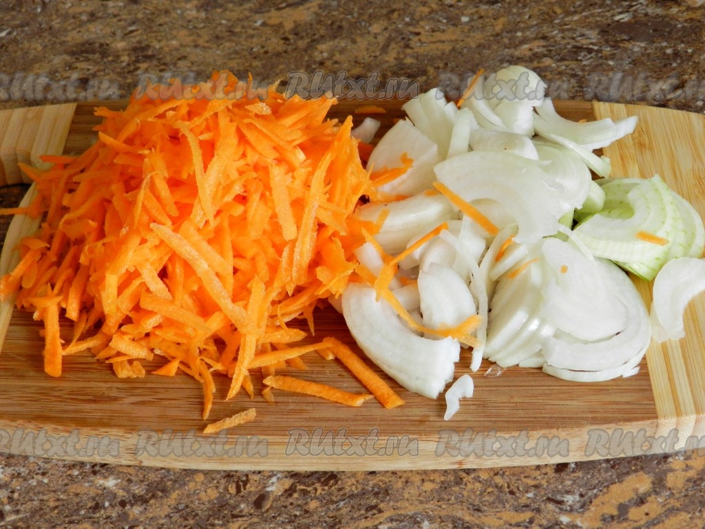 Обжарить лук и морковь на растительном масле до золотистого цвета. В процессе обжаривания посолить и поперчить.