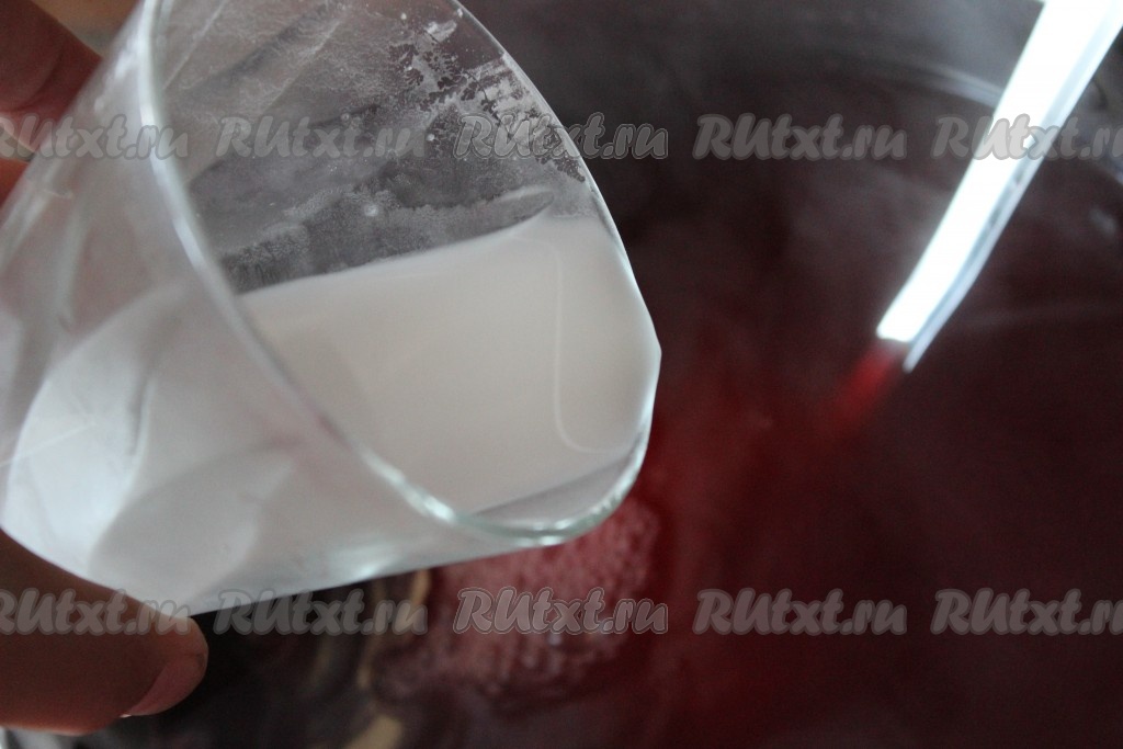Как только закипит ягодный компот, тонкой струйкой влить разведенный крахмал, при этом интенсивно и непрерывно помешивая, чтобы избежать образования комочков.