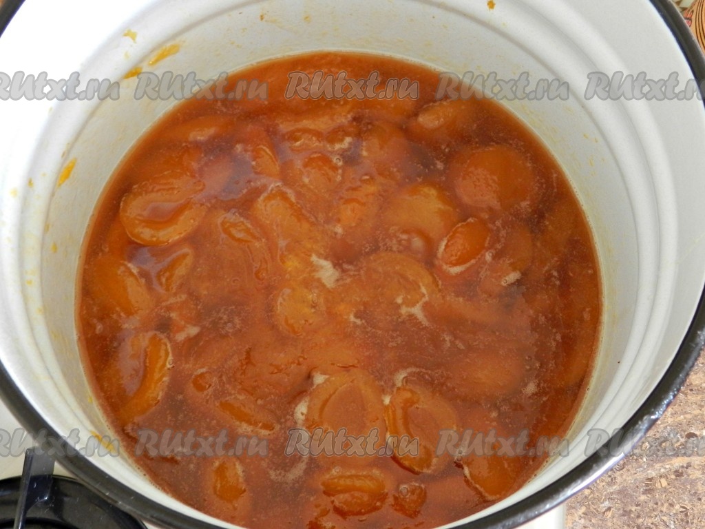 Утром снова поставить кастрюлю на огонь, довести до кипения и варить на небольшом огне от момента закипания 5-7 минут. Разлить горячее варенье из абрикосов по стерилизованным банкам, накрыть прокипяченными крышками, остудить и убрать для хранения.