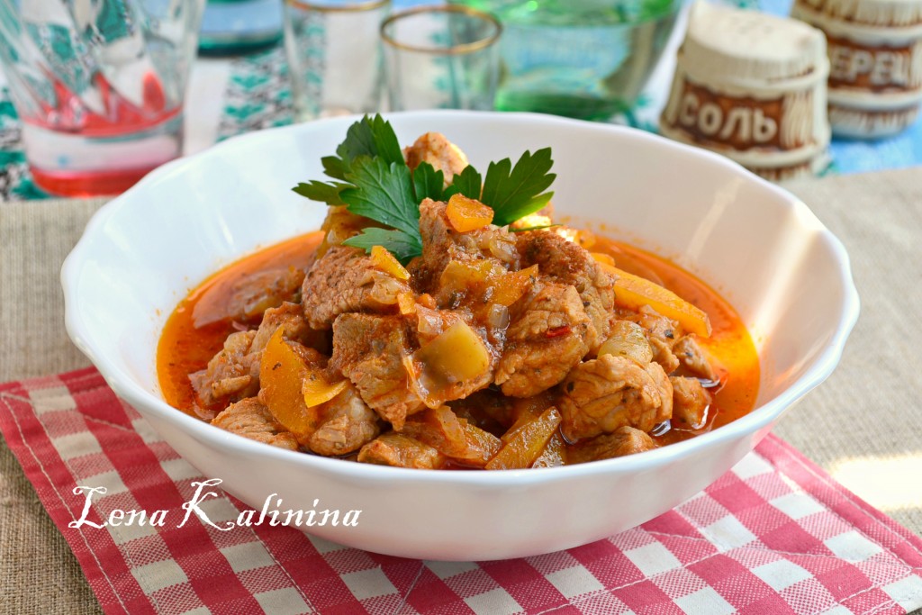 Очень вкусный гуляш из свинины с подливкой, приготовленный в мультиварке, подать к столу с гарниром.