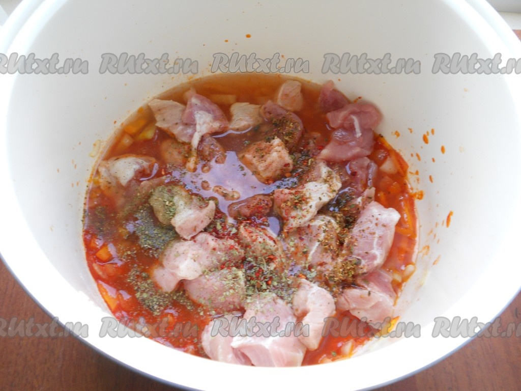 Свинину нарезать небольшими кусочками, выложить в чашу с овощами. Посолить, посыпать специями, добавить паприку и сахар. Влить горячую воду.
