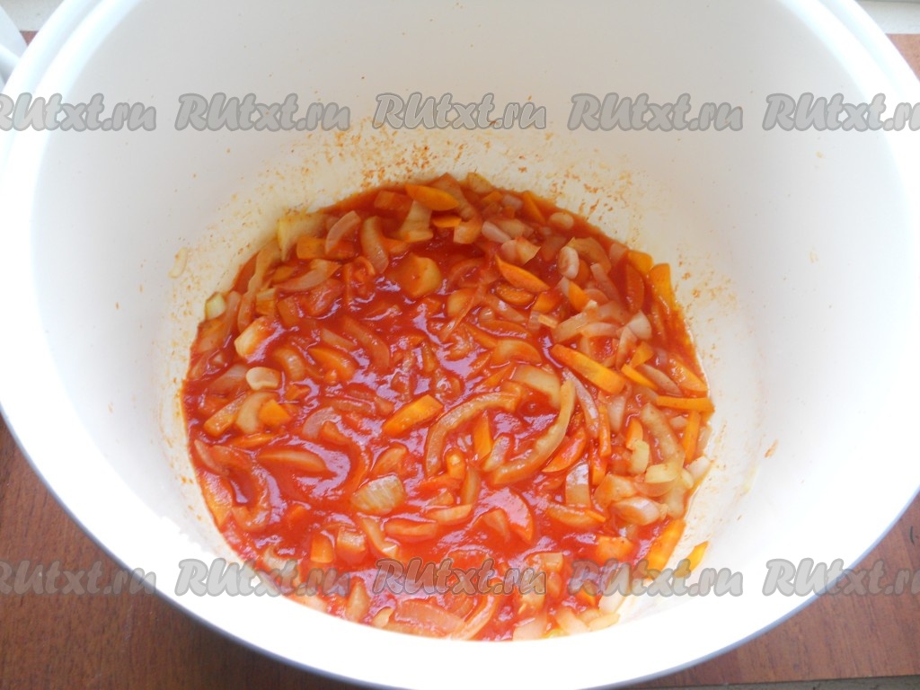 Через 5 минут после начала обжаривания добавить к луку с морковью нарезанный соломкой болгарский перец. Периодически помешивая, обжаривать овощи еще 10 минут. Далее добавить к овощам томатную пасту и влить немного воды, перемешать. Готовить оставшееся время.