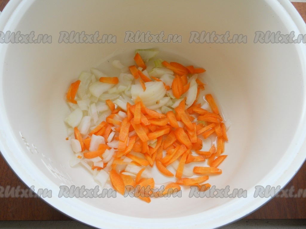 Влить в чашу мультиварки растительное масло, выставить программу "Жарка" на 20 минут. Очищенные лук и морковь нарезать кусочками, выложить в чашу и начать обжаривать, иногда помешивая.