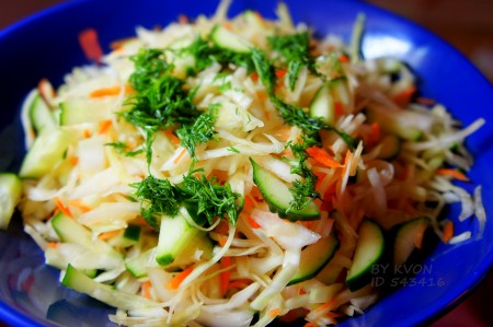 К капусте и моркови добавить нарезанные огурцы. Заправить салат. Витаминный салат готов. По желанию в салат можно добавить несладкое яблоко и/или болгарский перец.