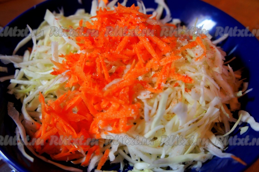 Капусту тонко нашинковать. Морковь натереть на крупной терке. Добавить сахар, соль, помять.