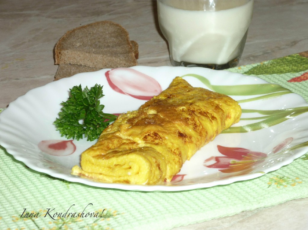 Затем с помощью лопатки, начиная с одного края, свернуть омлет рулетом.
