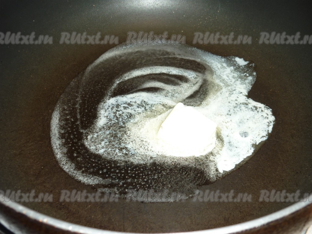 Сливочное масло отправить на сковороду и растопить, очень важно, чтобы масло плавилось, а не горело, поэтому огонь должен быть слабым.