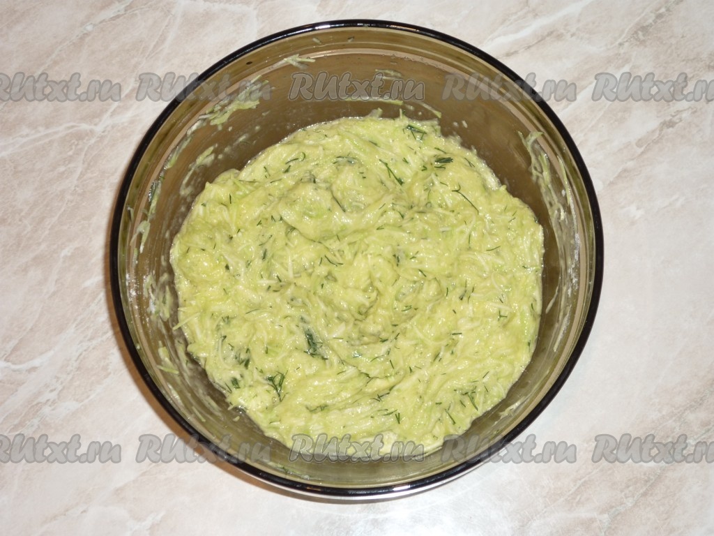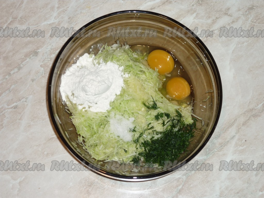 Добавить к кабачкам мелко нарезанный укроп, выдавленный через чесночницу чеснок, соль, муку и яйца.