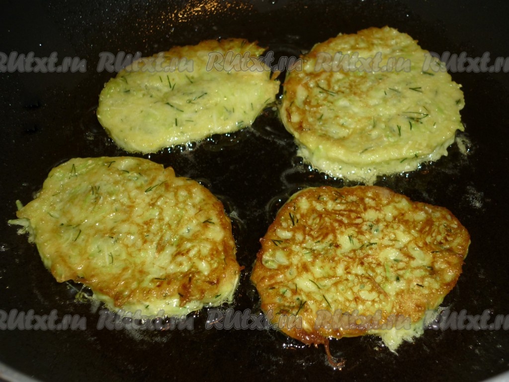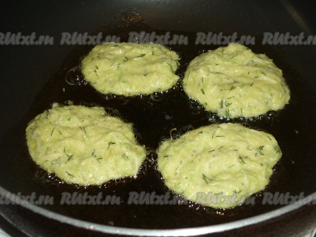 Сковороду хорошо разогреть с небольшим количеством растительного масла. Выложить тесто с помощью столовой ложки, формируя круглые оладьи из кабачков с зеленью и чесноком.