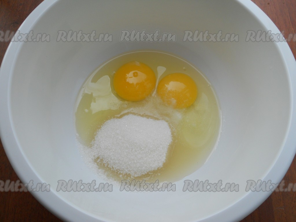 Взбить яйца с сахаром миксером до пышной, светлой массы (взбивать минуты 3-4 на максимальной скорости миксера). Добавить творожную массу и влить растительное масло, перемешать миксером.