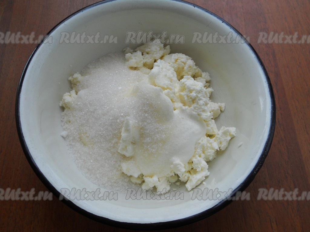 Свежие ягоды промыть водой, обсушить, разложив на бумажном полотенце. Если у ягод крупные косточки (например, черешня, вишня), тогда косточки нужно удалить. Если ягоды замороженные и на них нет большого количества льда, значит их можно не размораживать. Для приготовления творожной массы нужно в достаточно глубокую миску выложить творог, добавить сахар и сметану. Взбить творожную массу до однородности погружным блендером. Я этого не делала (просто растёрла ложкой), очень любим ощущать творог в готовом тесте.
