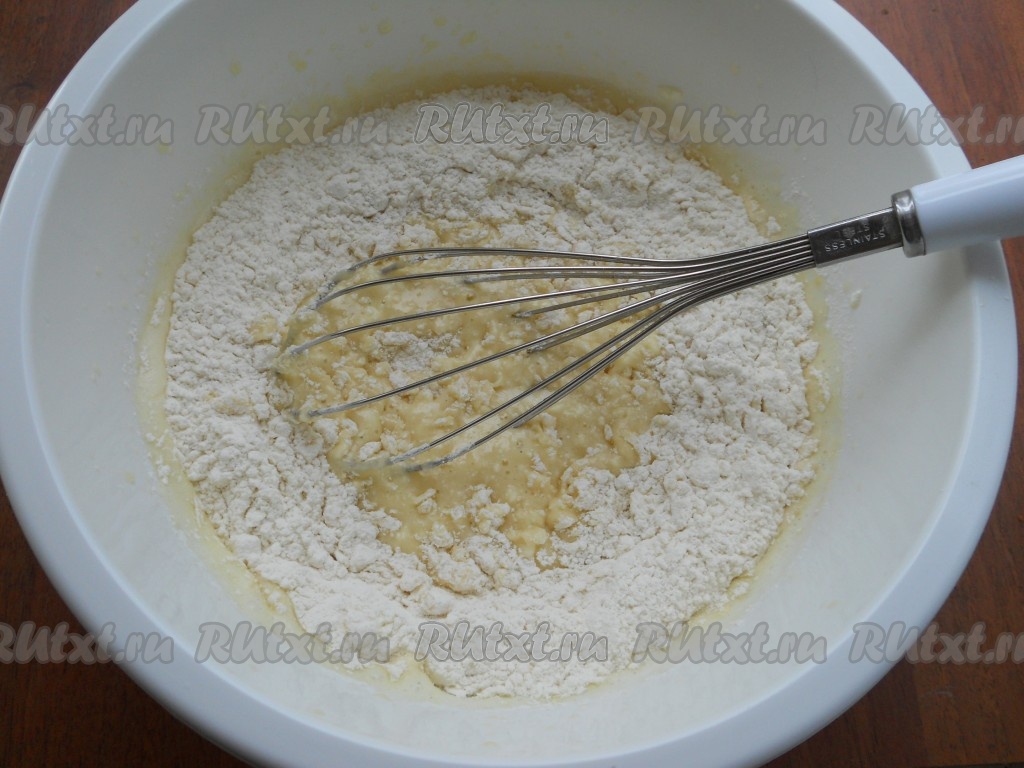 Всыпать 100 грамм просеянной муки, добавить весь разрыхлитель, перемешать венчиком.