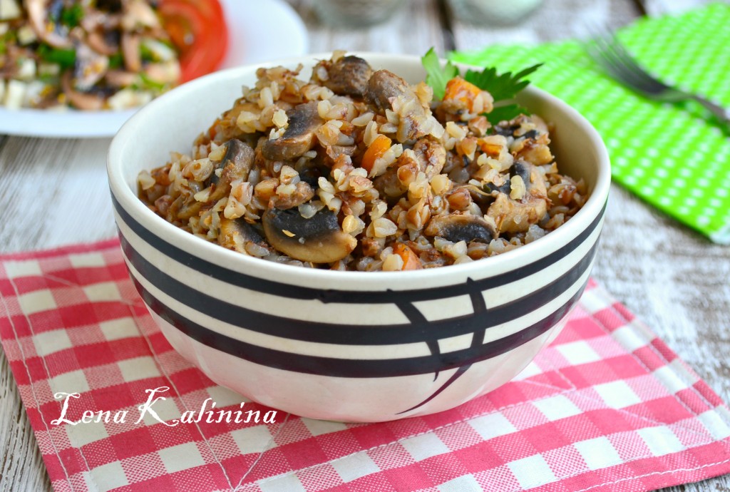 Очень вкусную, рассыпчатую, ароматную гречку с шампиньонами, приготовленную в мультиварке, подать к столу с овощами или соленьями.