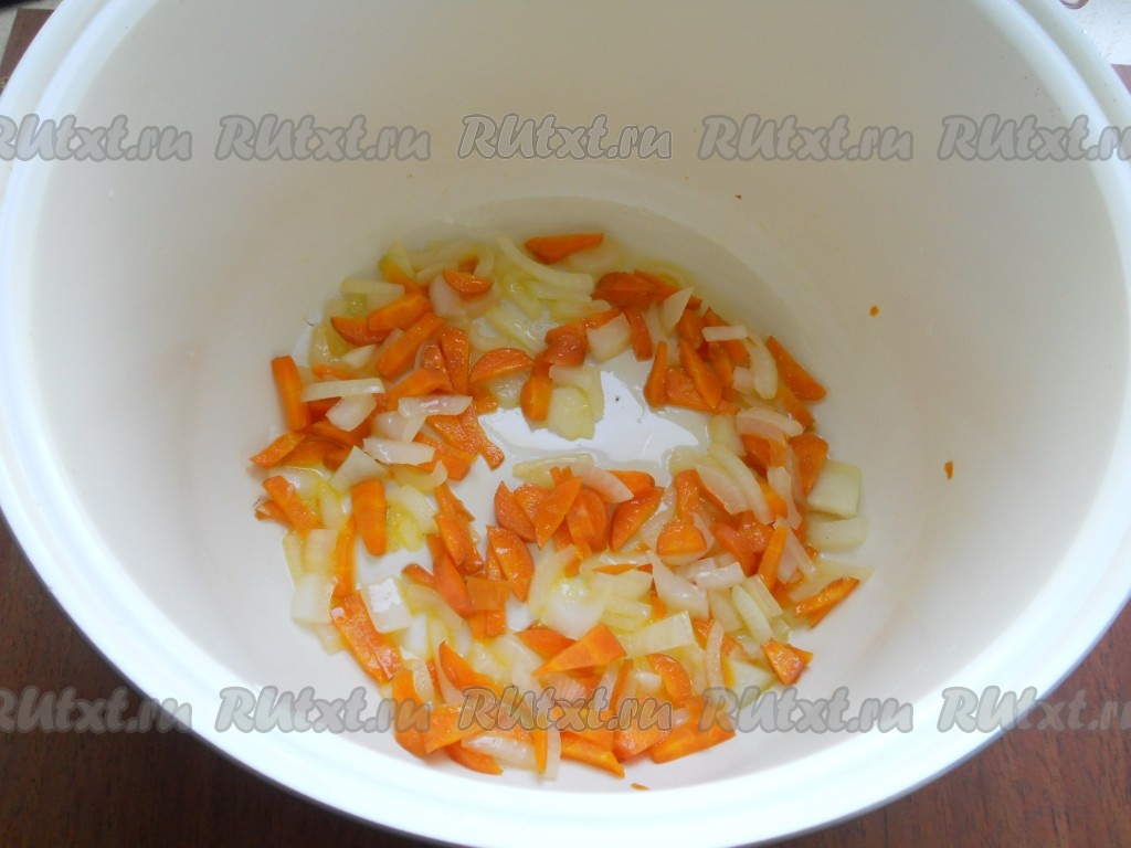 В чашу мультиварки налить растительное масло и выставить на 20 минут программу "Жарка". Через 5 минут после начала программы выложить в чашу морковь и лук, обжаривать 10 минут, иногда помешивая.