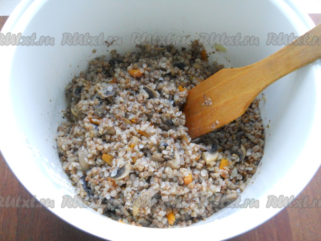 Выставить программу мультиварки "Каша" или "Гречка" на 45 минут. Готовую гречневую кашу с грибами перемешать.