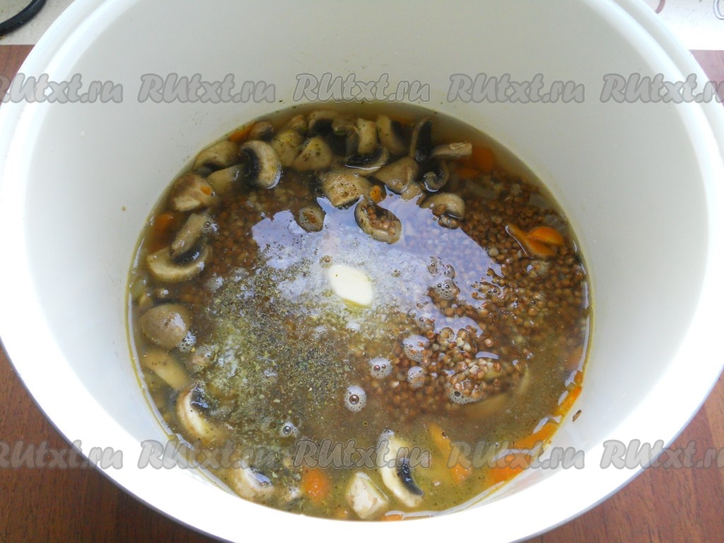 Далее к шампиньонам, луку и моркови добавить гречневую крупу, соль, специи по вкусу, горячую воду, закрыть крышку мультиварки.