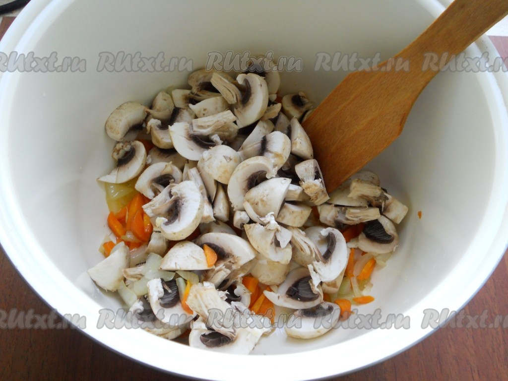 К луку и моркови в чашу мультиварки выложить грибы и, перемешав, обжаривать оставшиеся 5 минут.