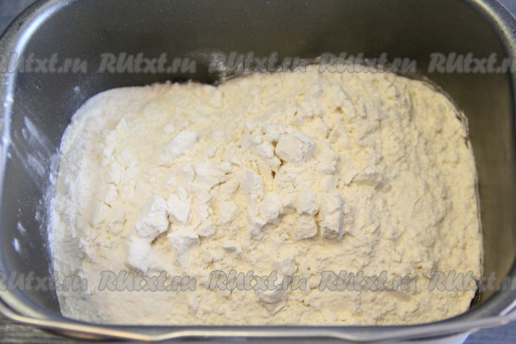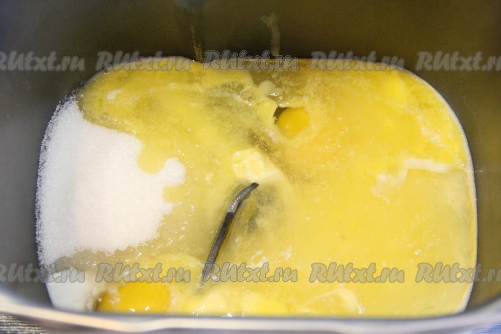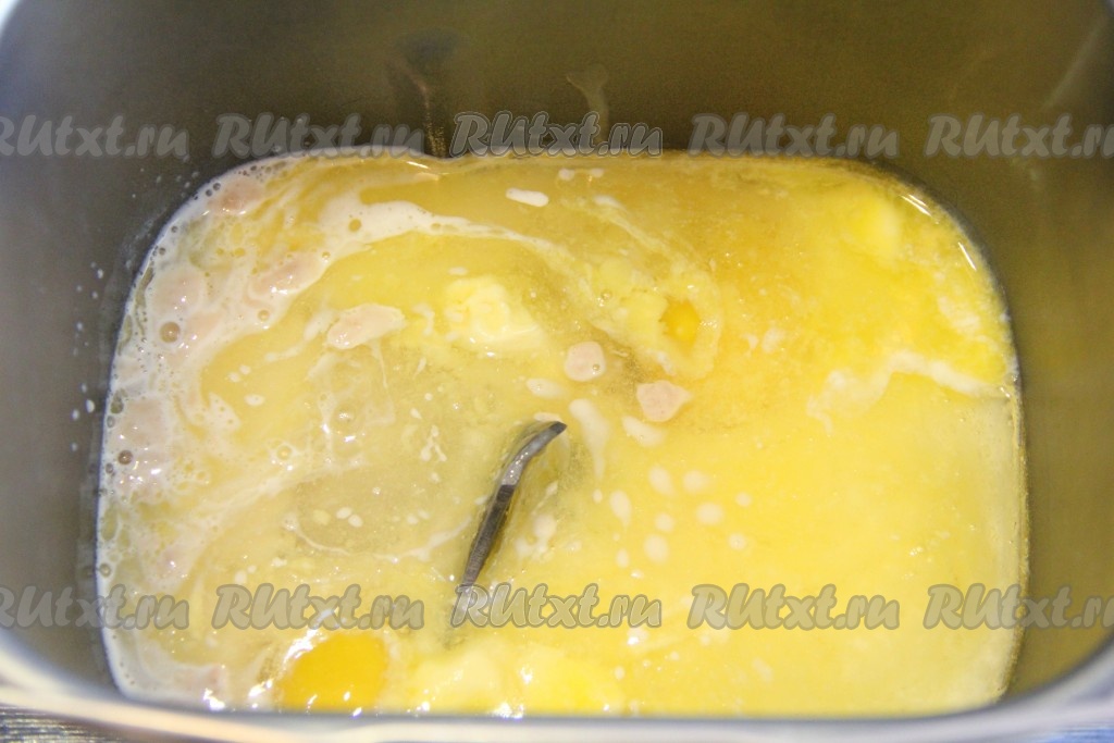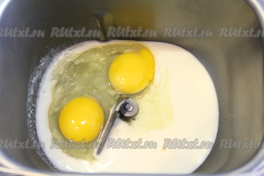 Если замешивать тесто в хлебопечке, то в ведёрко хлебопечки влить кефир комнатной температуры, добавить яйца и растительное масло.