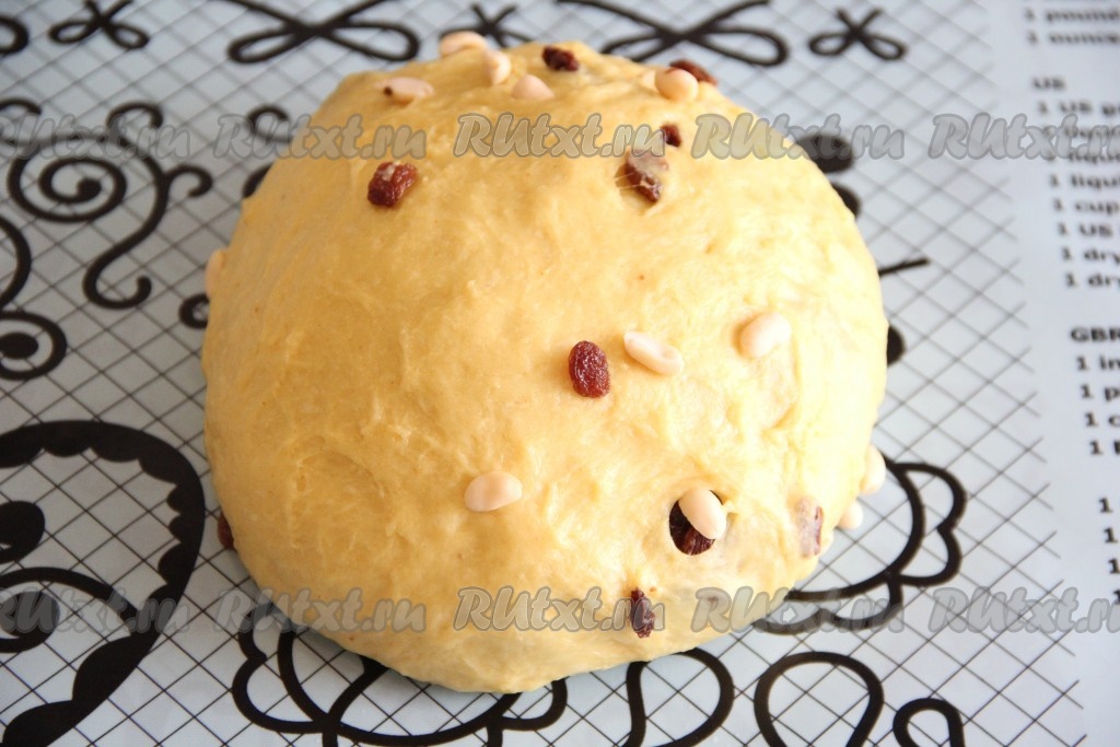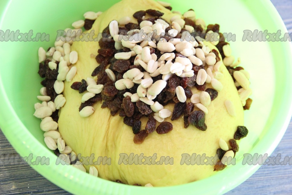 Готовое дрожжевое тесто для булочек хорошо обмять, добавить орехи и изюм.