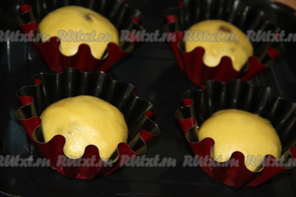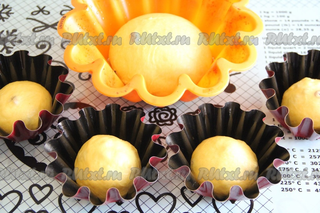 Булочки можно сформировать по-разному, я предлагаю выпекать в формах для кексов (предварительно формочки можно смазать маслом). Тесто разделить на небольшие части, скатать шарики и разложить по формочкам для кексов, заполняя их на 1/2 объёма. Оставить тесто в формах на 1 час в тёплом месте.