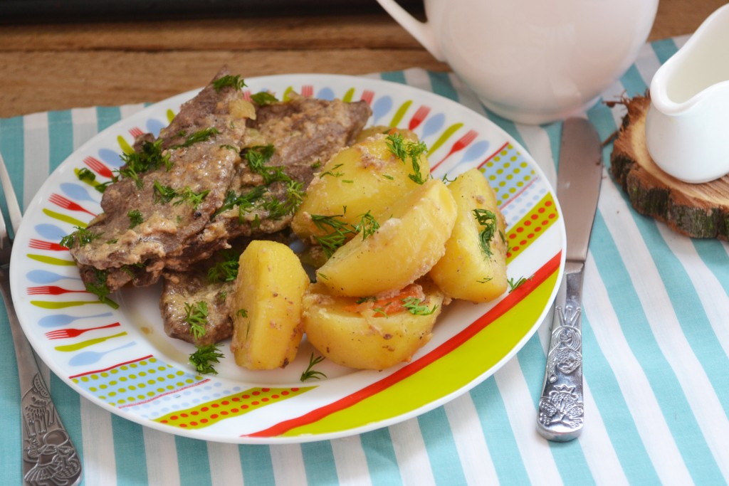 Свиная печень, приготовленная в мультиварке, получается нежнейшей и очень вкусной. Подаём её с картофелем, посыпав мелко нарезанным укропом.