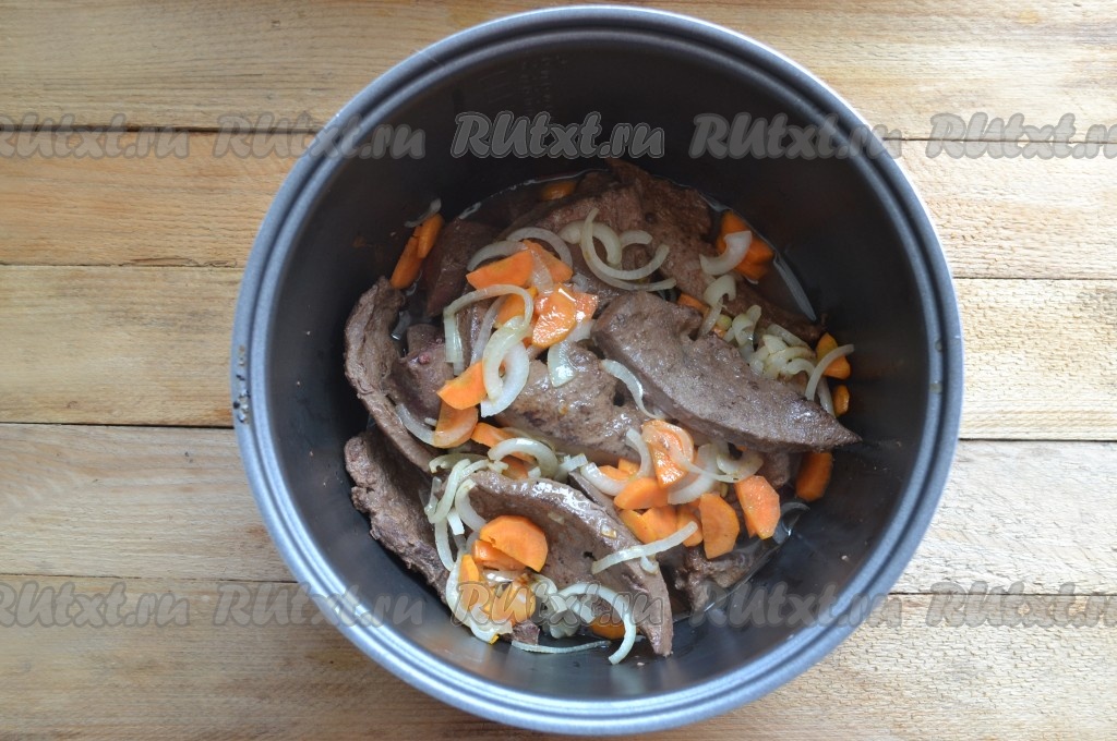 Лук и морковку добавляем к свиной печени в чашу мультиварки и обжариваем еще 2-4 минуты, иногда помешивая.