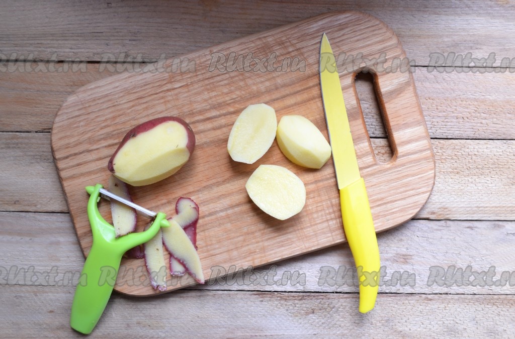Очищаем картошку и разрезаем её пополам. Если картофель крупнее среднего, тогда его необходимо разрезать на большее количество частей.