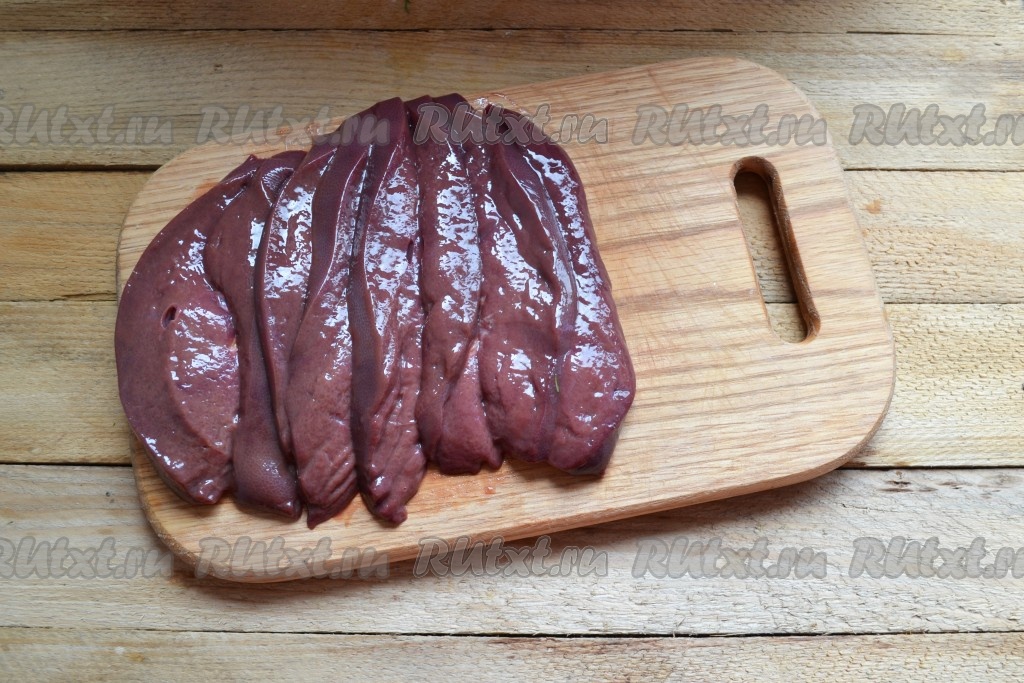 Свиную печень моем, удаляем прожилки, пленочку и нарезаем кусочками толщиной 1-1,5 см.