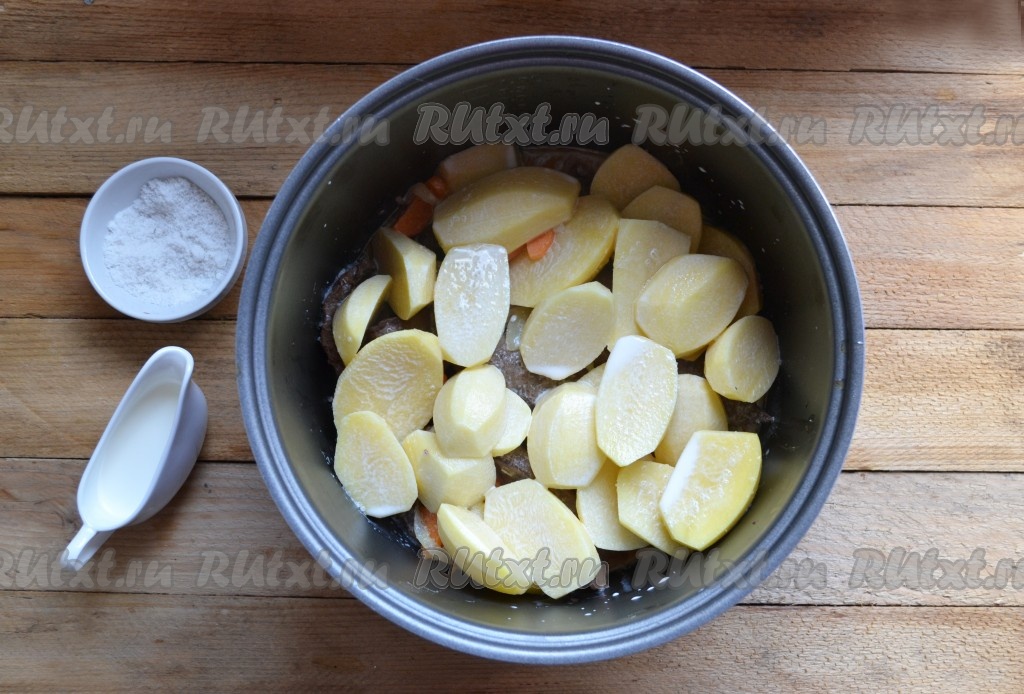 Выкладываем картофель к свиной печени в чашу мультиварки, добавляем соль, острый перец, вливаем сливки, закрываем крышкой. Включаем функцию "Тушение" на 45 минут.